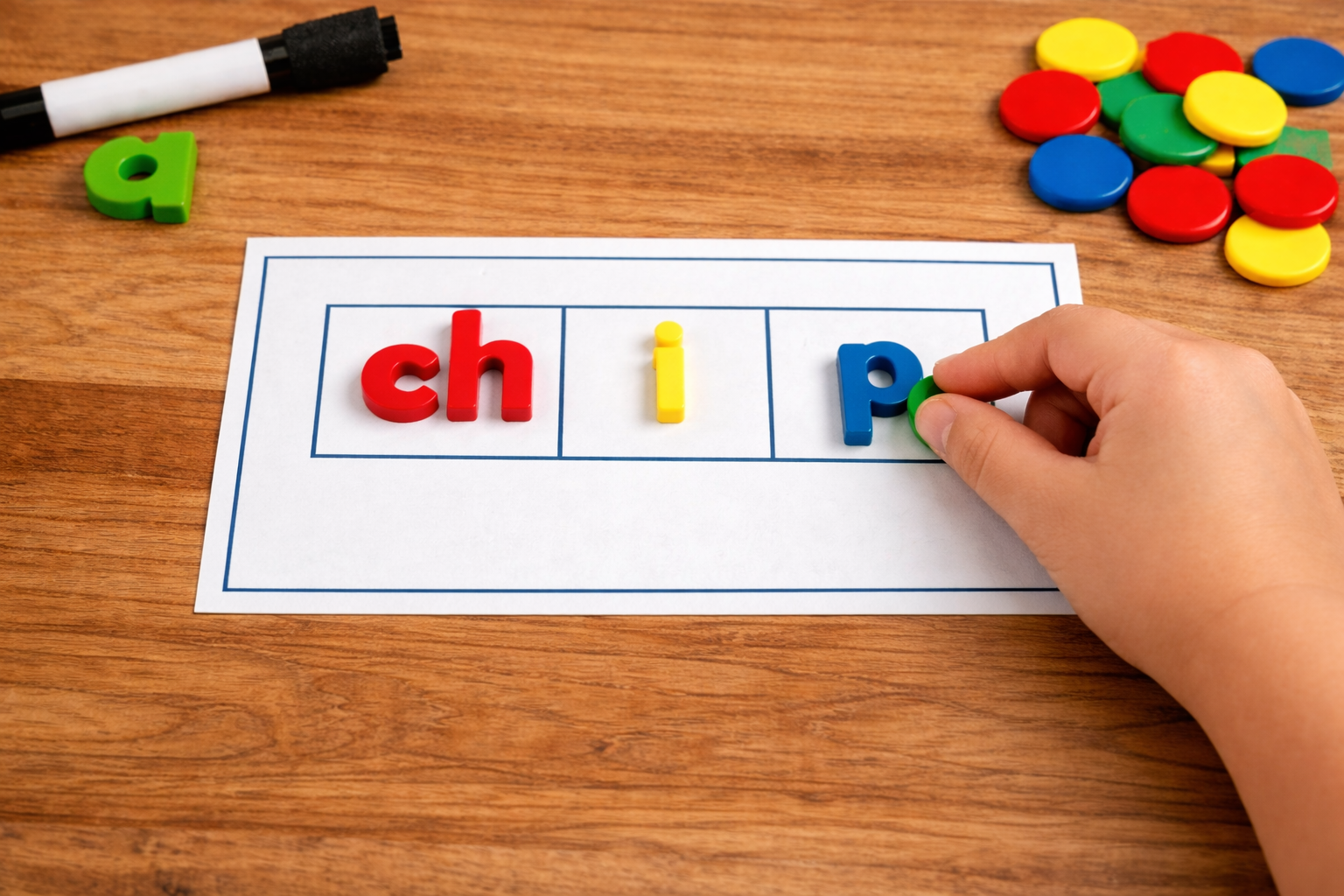 Elkonin boxes (or sound boxes) serve as an effective and valuable tool for enhancing phonemic awareness skills among young learners. This multi-sensory strategy is used to engage students in activities focused on identifying, segmenting, blending, and manipulating individual sounds (phonemes) within words. Through guided exercises, students listen attentively as teachers pronounce words aloud, then carefully place tokens or manipulatives in corresponding boxes to represent each sound they hear. For example, for the word “chip”, students would push 3 magnets into the boxes for /ch/ /i/ /p/. Elkonin boxes can also be used to help with syllable awareness and spelling. This hands-on research-based approach fosters a deeper understanding of the relationship between sounds and letters, laying a solid foundation for literacy development.